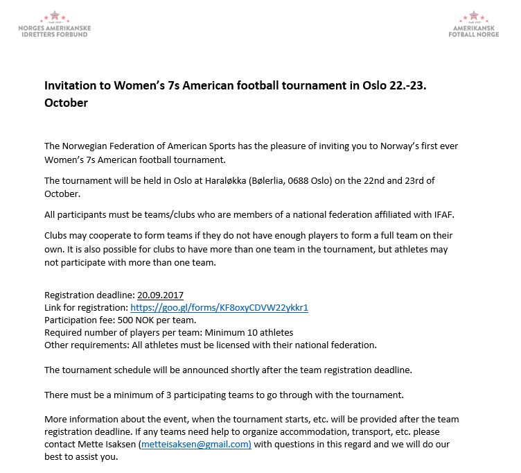 Turneringen finner sted hvis det er 3 eller flere deltakende lag. Med 7 spillere for hvert lag på banen av gangen bør det finnes et visst håp om at det lar seg gjøre for også flere enn 2 norske lag å stille opp. De to gjentakende lagene som skulle deltatt i høstens seriespill, Haugesund Hurricanes og Vålerenga Trolls, spiller forøvrig et par kamper seg i mellom i den kommende tiden – den første allerede førstkommende lørdag i Haugesund. Håpet er at turneringsspillet kan ytterligere styrke tilbudet til både disse lagene og andre damespillere i Norge, og bidra til å blåse mer liv i kvinnefotballen igjen.