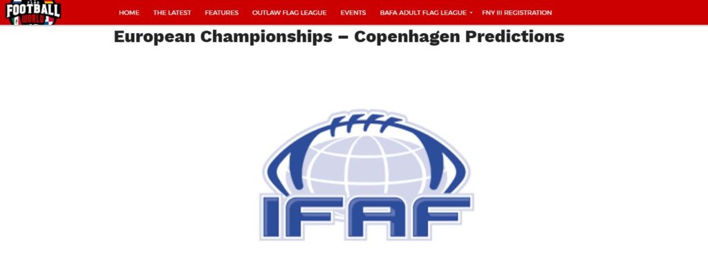 Den britiske websiden Flag Football World er en svært aktiv side og ressurs med mye innhold om flaggfotball. De har også kikket nærmere på EM i København og lagene som skal konkurrere der i helgen, og har tippet hvem som vinner og hvordan det går for de andre lagene i turneringen. Deriblant Norge!