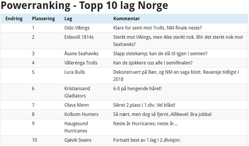 Eliteserien: Det har gått en kamp siden forrige ranking, og det var mellom #1 og #2. Tidlig i kampen så det ut som om vi kunne få et skifte av hvem som er hvem i så måte, men etterhvert ble det klart at Oslo Vikings fortsatt er Norges beste lag. Eidsvoll 1814s gjorde seg derimot ikke bort, og viser at de har noe på gang. De beholder dermed #2 også denne uka, men nå skal de på besøk til #3 som de tapte mot sist lagene møttes. Et tap nå betyr farvel til NM-drømmene for Eidsvoll. En seier for Åsane Seahawks betyr en finaleplass for dem, og definitivt en sementering av topp 2-plassering i powerrankingen. Så skal vi ikke glemme at Vålerenga Trolls sniker rundt i bakgrunnen og pønsker på hvordan de skal sjokkere oss alle, trolig inkludert seg selv, gjennom å vinne sin semifinale mot #1…